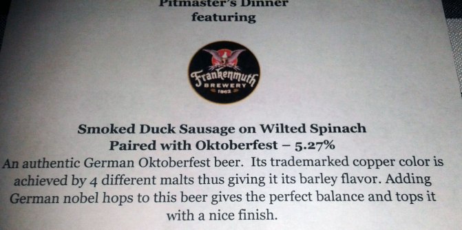 It was great getting to talk to Frankenmuth’s Brewmaster (Jeff) and their representative (Chuck). It was rather flattering to see that despite only being at one Pitmaster’s Dinner, Head Chef Scott remembered me. The only thing that was unfortunate was that I lost my camera at Somerset, so some of the pictures may not be up to par compared to the last review. Luckily my cousin Sarah had a comparable camera that I helped her pick out, so I’m glad I forced her to come out.