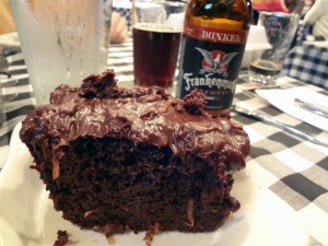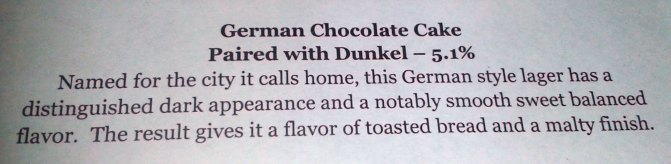The final course was German Chocolate Cake. I’m not a huge chocolate cake fan, but this one was delicious. It was not too sweet, and the pecans and coconuts in the frosting (which was infused with the Dunkel) was great. Most of us at the table couldn’t finish the whole cake in this sitting, but the frosting was gone so that only the cake remained for another day. The cake was very rich and cut the bitterness of the dunkel.