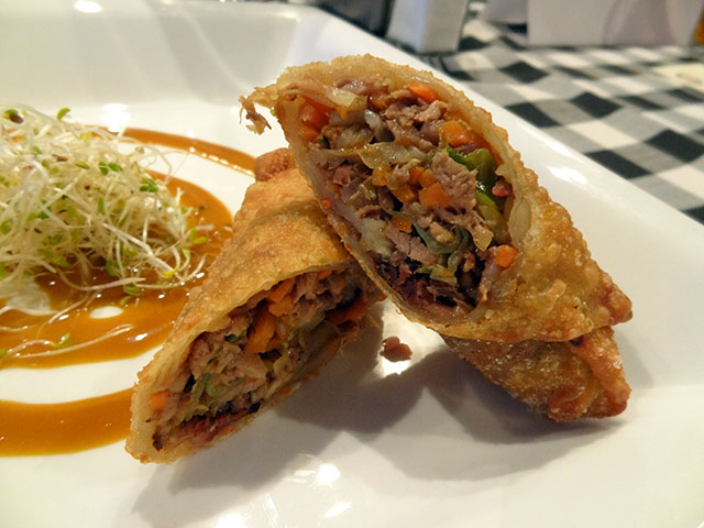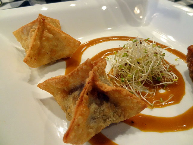 The first course was burnt end potstickers and asian smoked sirloin egg rolls. The beer that was chosen as the pairing was Sacred Cow IPA. I’ve had this beer before while in Ann Arbor and it is probably one of my favorites. It is particularly hoppy (which I love in a beer), but it was still very light. I enjoyed it very much. The food that came out with it had great presentation as well as great flavor. The veggies in the egg roll kept it from being a very heavy dish from the sirloin but the sirloin flavor was present throughout. I expected that with a beef-centric dinner the food would be very strong and well heavy. I can’t really come up with a synonym to otherwise describe my expectation. The egg roll by itself was delicious, but when combined with the mustard sauce that adorned the plate the contrast between the sweet and savory was amazing. The skin was very light and flaky unlike a lot of egg rolls that I’ve eaten and that just helped to lighten the dish up. The potstickers were made with burnt ends and were saturated in the burnt end flavors. They tasted delicious but were decidedly heavier than the egg rolls. They contained less veggies and were saucier but the burnt end flavor really shines through. When eaten with the beer, it did seem to lighten it all up. The course almost made the beer sweeter.