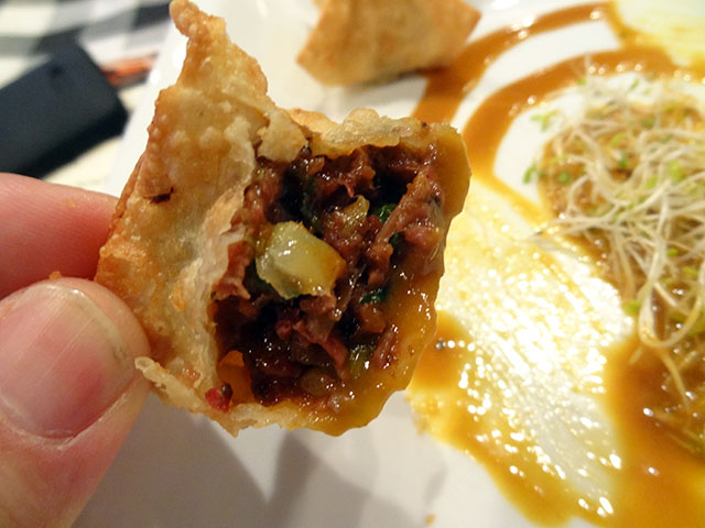 The Belgian Tripel was served next. I like my belgians and this one had a pretty sweet aftertaste. It had an apple aftertaste that was just delightful. The beef sausage was really great. I even asked Bubba how to make it. He said it was a pain to make, and that he’d show me if I’d make it haha. It was spicy. Like a front kick, and a lingering spiciness. It was awesome. I wish it had more heat but that’s cause I like spicy food and most people probably couldn’t deal with it. The sour cream and refried beans were there solely to help reduce the heat for the jokers that couldn’t take it. The more of the sausage you ate, the hotter it got. It was great. The beer when paired with the sausage didn’t really enhance the food, but the food did bring out the sweetness of the Tripel.