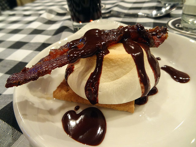 Dessert was a candied piece of beef bacon on top of a gooey s’mores. This was served with an Irish Stout that was almost coffee-like but was mostly reminiscent of dark chocolate throughout. The bacon was very much like beef jerky, but with brown sugar tones throughout. It tasted mostly of pepper that contrasted well in both texture and taste with the gooey sweetness of the marshmallow s’mores. I could get used to eating it. I’ll have to figure out some kind of substitute to eat with my next s’mores endeavor that is less time-intensive. Because planning 14 days in advance of eating a s’mores is not going to happen.