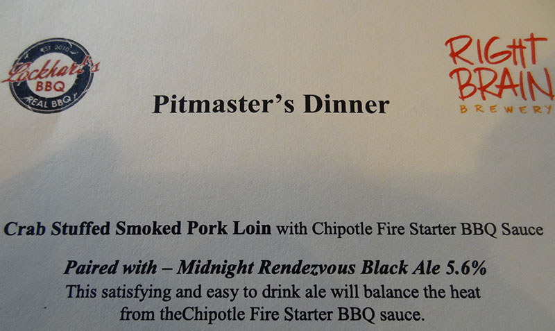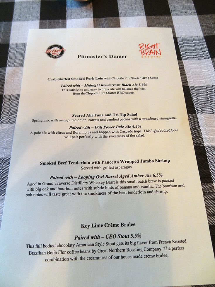 June 11th, 2013 rolled around this year with another Pitmaster’s in tow. This time the theme for the dinner was Surf & Turf. The price tag was on the higher side (at $75) but as always it was delicious. The brewery paired with this dinner was the Right Brain Brewery from Traverse City.