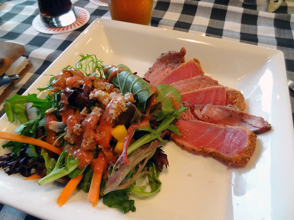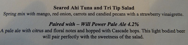 The second course was a Seared Ahi Tuna and Tri Tip Salad served with a spring mix and mango, red onion, carrots and candied pecans with a strawberry vinaigrette. This was paired with the Willpower Pale Ale (4.2% ABV) which served as the brewery’s original beer. As pale ales go, it was not too bitter. There is a bit of bitterness but then lightens up almost immediately. There is a very floral flavor to the front of the beer, with some citrus sprinkled here and there. I primarily can taste the floral notes, which is what I think lightens the beer up considerably.