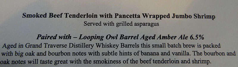 The main entrée was Smoked Beef Tenderloin with Pancetta Wrapped Jumbo Shrimp served with grilled asparagus. The pairing beer was the Looping Owl Barrel Aged Amber Ale (8.5% ABV). I generally like beers that have been aged in a bourbon barrel – period. This beer was no exception. There was a very heavy bourbon taste at the front before lightening up into something much lighter. I had expected a more hoppy beer and was pleasantly surprised by the generous amount of bourbon flavor I was getting in such a light beer.