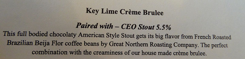 Dessert was a delicious Key Lime Crème Brulée paired with a CEO Stout (5% ABV). Now crème brulée is one of my favorite desserts ever, so to say I was excited for it is a huge understatement. And it did not disappoint. It had a nice hint of key lime throughout, but maintained the deliciousness that is crème brulée.