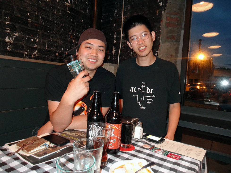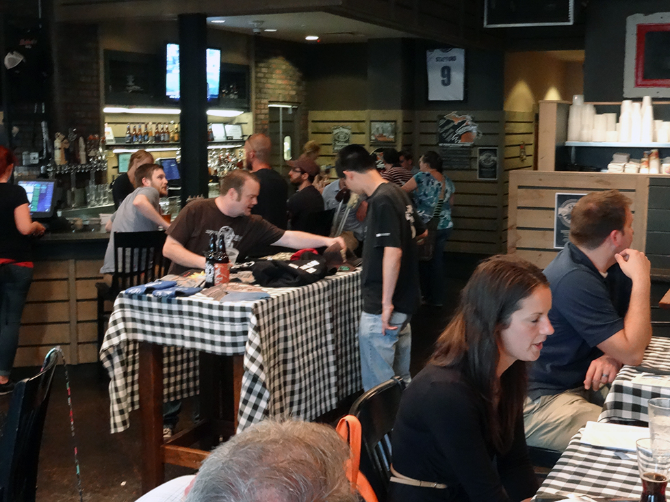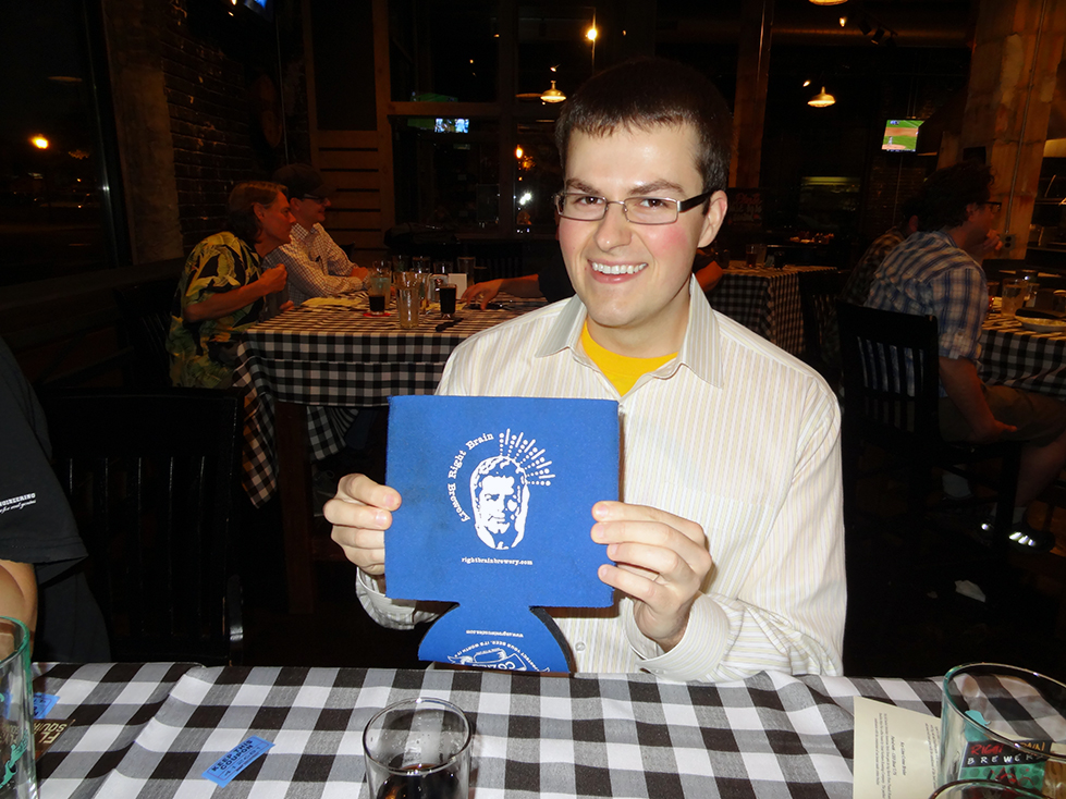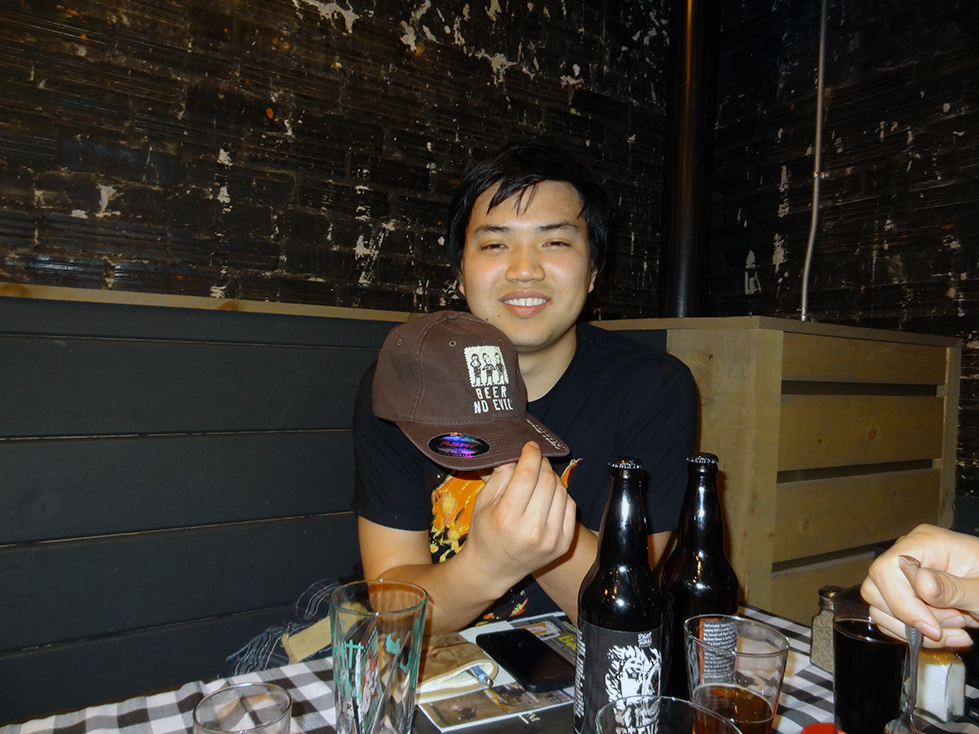 Right Brain representative Dave came prepared with swag and a raffle. But not just a raffle, he had enough prizes for everyone in attendance. It was just a matter of who got first pick. Luckily our boy Elson got second pick and wisely chose the set of two hard to find, bottled beers. After that I managed to snag a pretty cool hat, and John got a growler cozie for the growler he has at home.