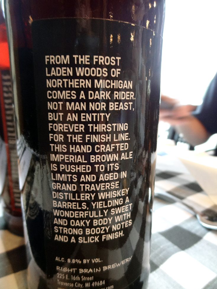 I can honestly say I haven’t heard of Right Brain before, but they also have only been brewing for 5.5 years. Recently moved to a new complex, and are located pretty far north in Michigan. They brew beers that are sometimes never brewed again. They experiment a lot and at their pub, you can find a lot of one-offs that you wont’ see anywhere ever again. What I can say is that every beer they brought to the dinner was delicious. I think I ordered seconds of almost every beer, and the only reason I didn’t order a second of the Looping Owl is because I had to drive home.