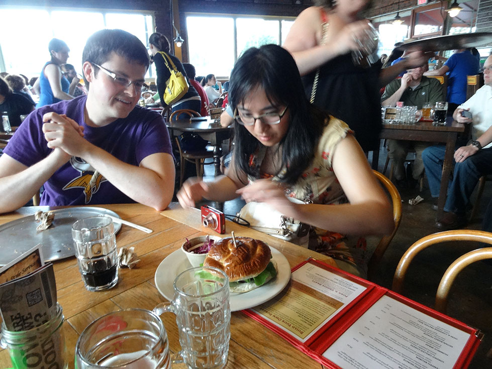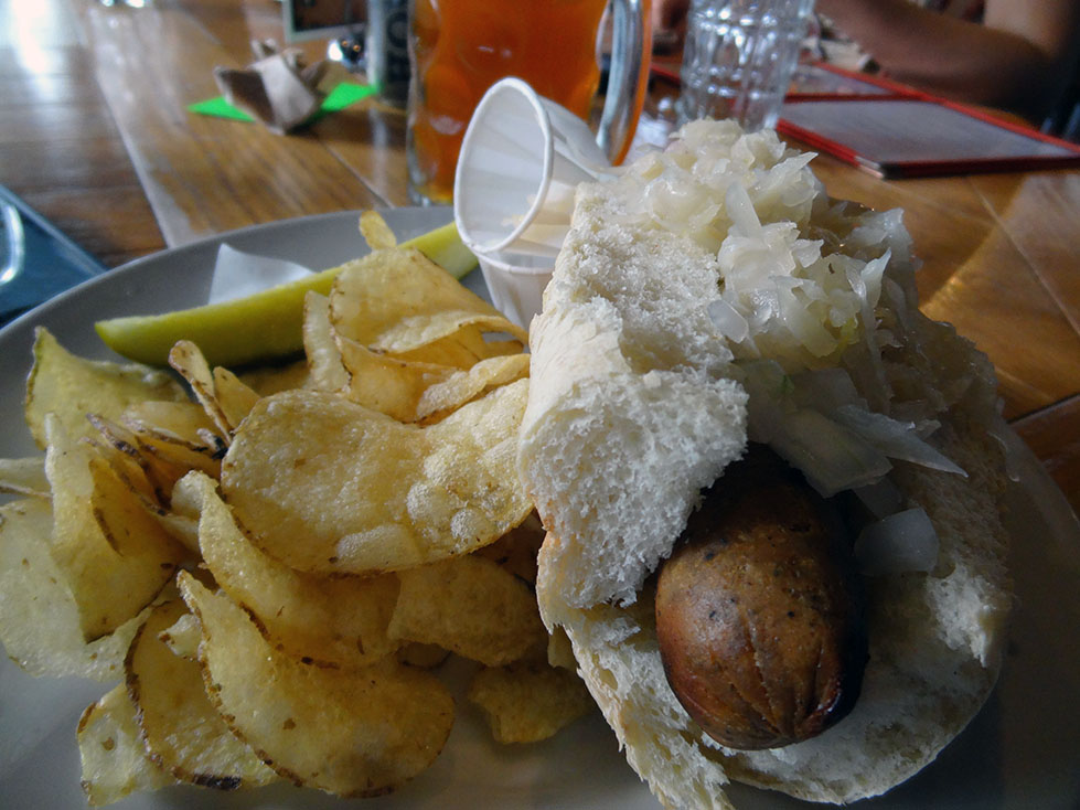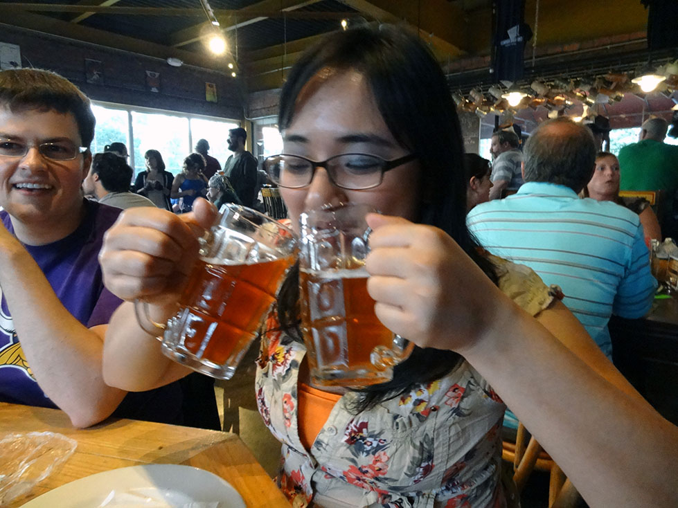 We arrived around 7 PM, and we were definitely hungry. Unfortunately it had been raining so the beer garden was pretty empty at the time we arrived. One of the great things about Corner Brewery is their diverse menu, and if you have friends that are vegetarian they have vegan and vegetarian options for them too! One of my favorite things there is the pizza, the crust is sublime. What I actually ordered that night was the veggie brat because it piqued my curiosity. It definitely tasted like some Chinese dish I’ve had before but I could NOT put my finger on it and neither could Sarah. I devoured it and we continued to drink. Of course I ordered a Velvet Hammer immediately.