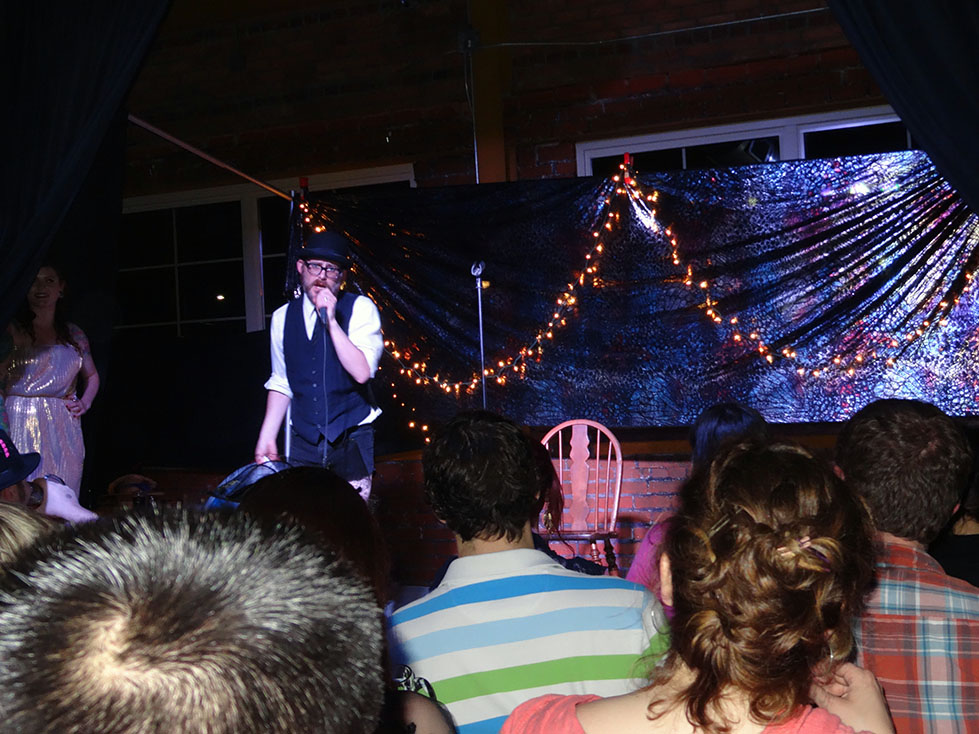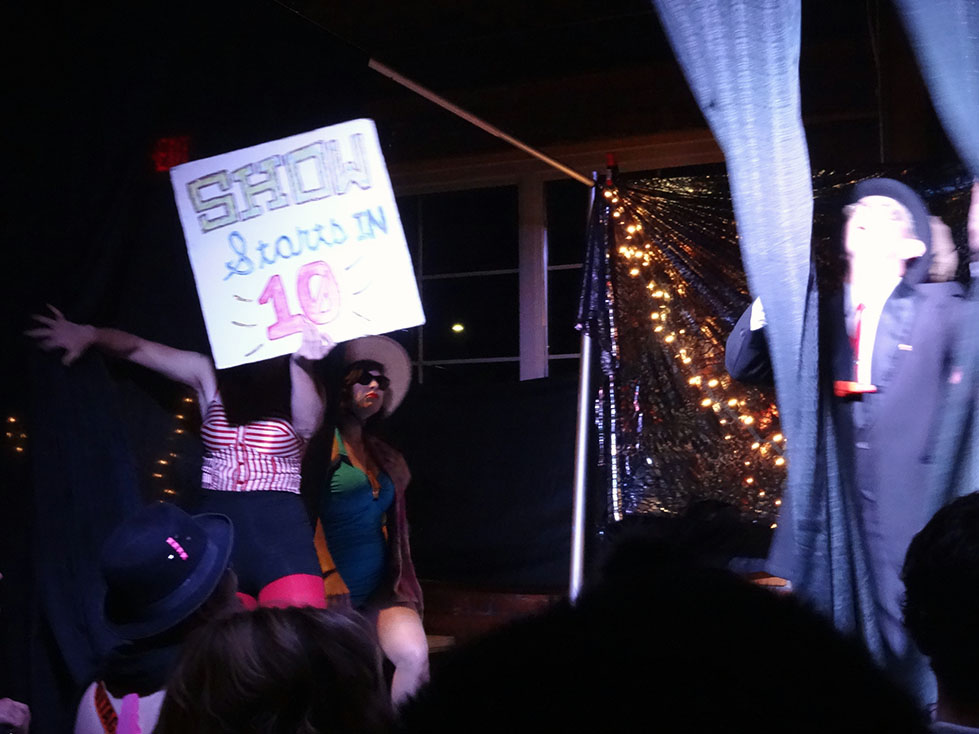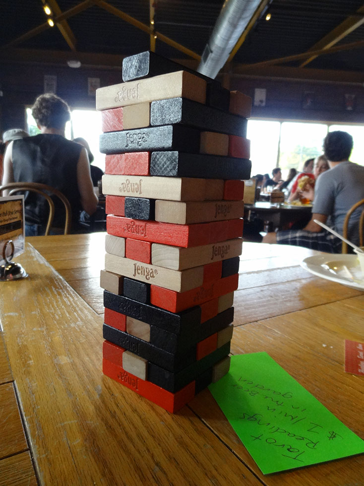 While we were drinking and waiting for the Burlesque show to start (more on that later), Twin went into their pile of games and pulled out an old jewelry box intent on discovering the contents enclosed within. We were delighted to see Jenga, but not just any Jenga – drinking Jenga! Every colored block had a question or a dare or something on it that you were supposed to do. Someone had written “would you rather?” questions on the plain wood blocks and so we started a game to pass the time.
