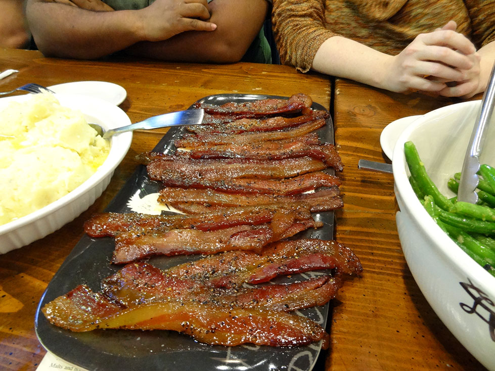 I ordered green beans, smoked bacon, and garlic mash for my sides and it was all soooo delicious. I was a little concerned we might not have enough food for everyone, but John pointed out that we only worked our way through half the pig. By the time we tore into the other half everyone was already almost full. We managed to finish a majority of the food. I took home the leftover sides and pork as well as the bones. The bones will make for a hearty soup, though I have no idea how to use the head so I’m giving that to Sarah. Also I’m splitting the bones with her, because there are a lot of bones and I can only make so much soup stock.
