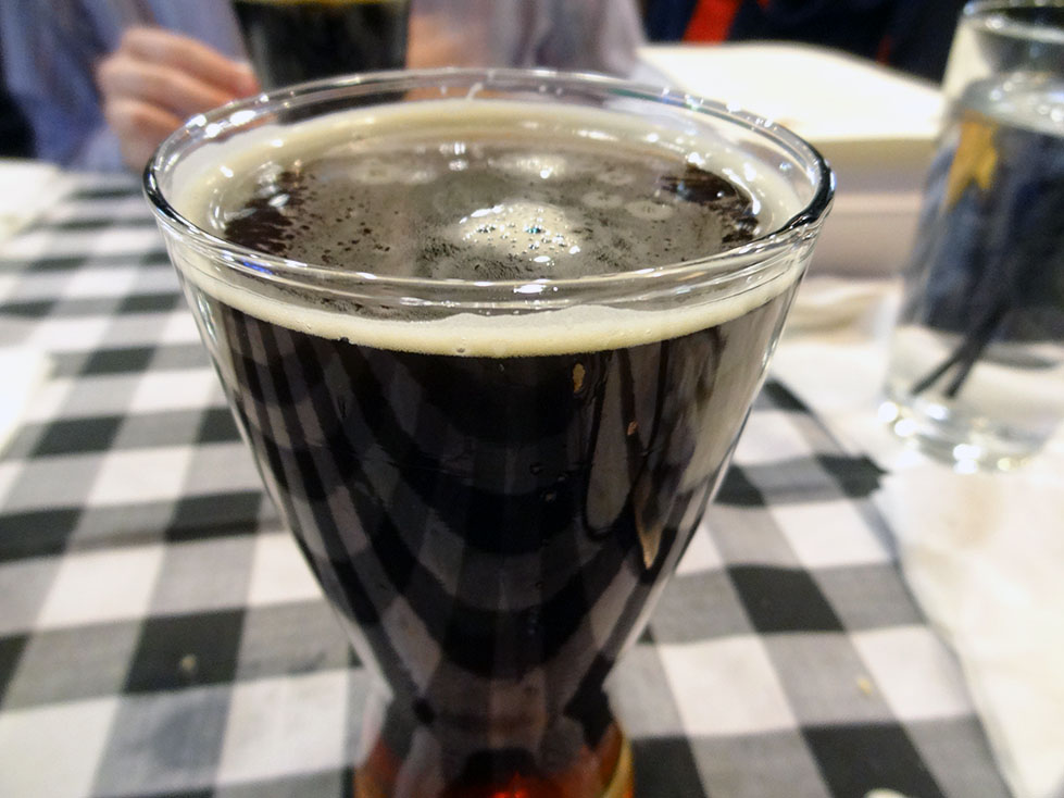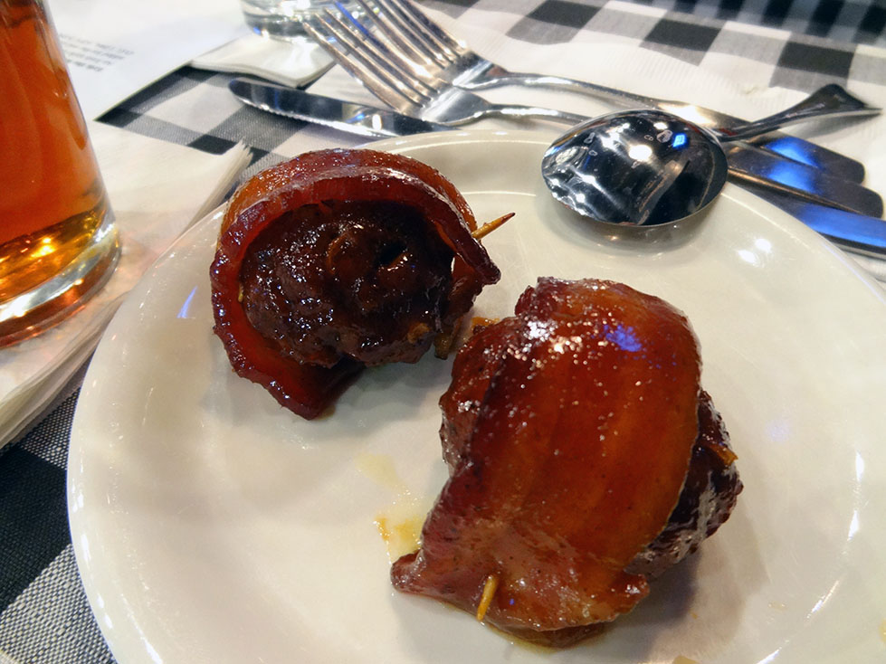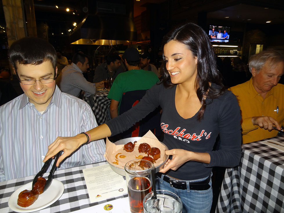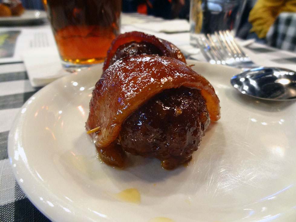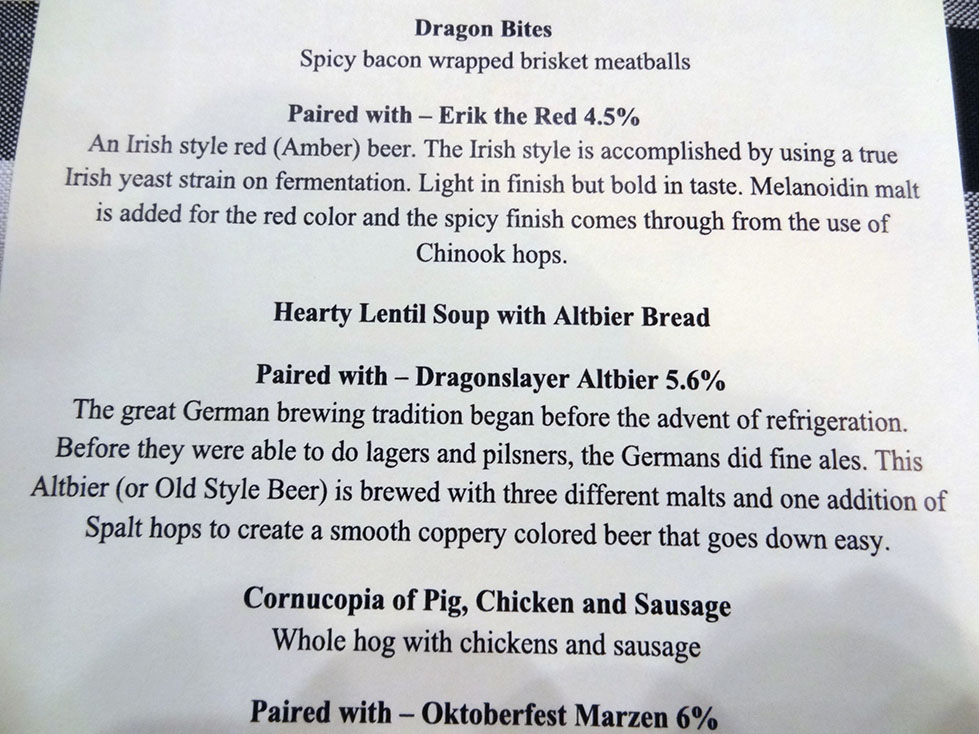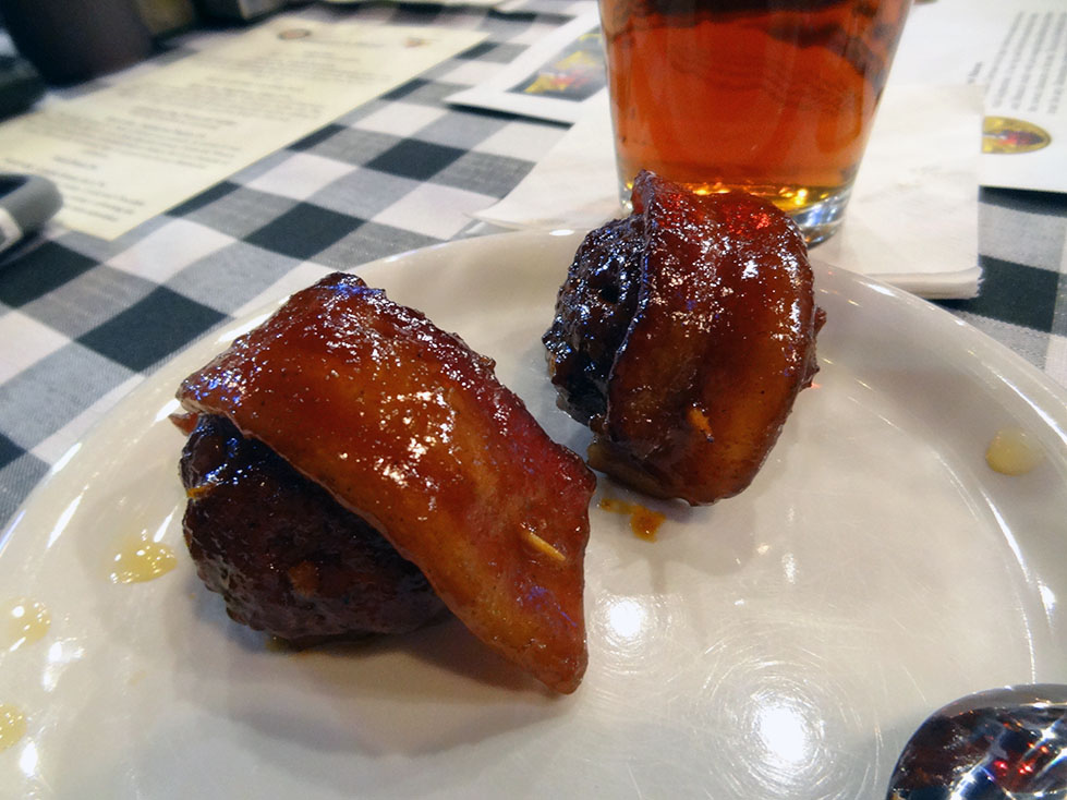 The first beer we received was a pint of Erik the Red. This was a very smooth red ale with a slightly bitter finish. It was very light and a great way to start the dinner. The first course of the meal were “Dragon Balls”. They are labeled Dragon Bites, but Bubba told us they were originally to be named Dragon Balls. When they were served to us, they looked amazingly delectable. The dish smelled very sweet and the BBQ sauce they were cooked in permeated the air. The bacon flavor of the dish was not overwhelming, which I find is usually the case with dishes that include bacon. This was a pleasant surprise, and I enjoyed that the bacon was also not overly crispy or super floppy. It was firm with a slight crunch. The meatball melted in my mouth and provided great contrast of texture with the bacon. In addition, because of the spicy sausage (a Lockhart’s recipe) there was a nice bit of heat at the tail end of the meatball. When eaten in conjunction with the beer, it enhanced the flavors in the meatball then cleansed the palate. I would say that Erik the Red tames the dragon.