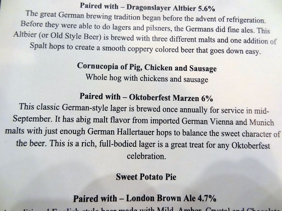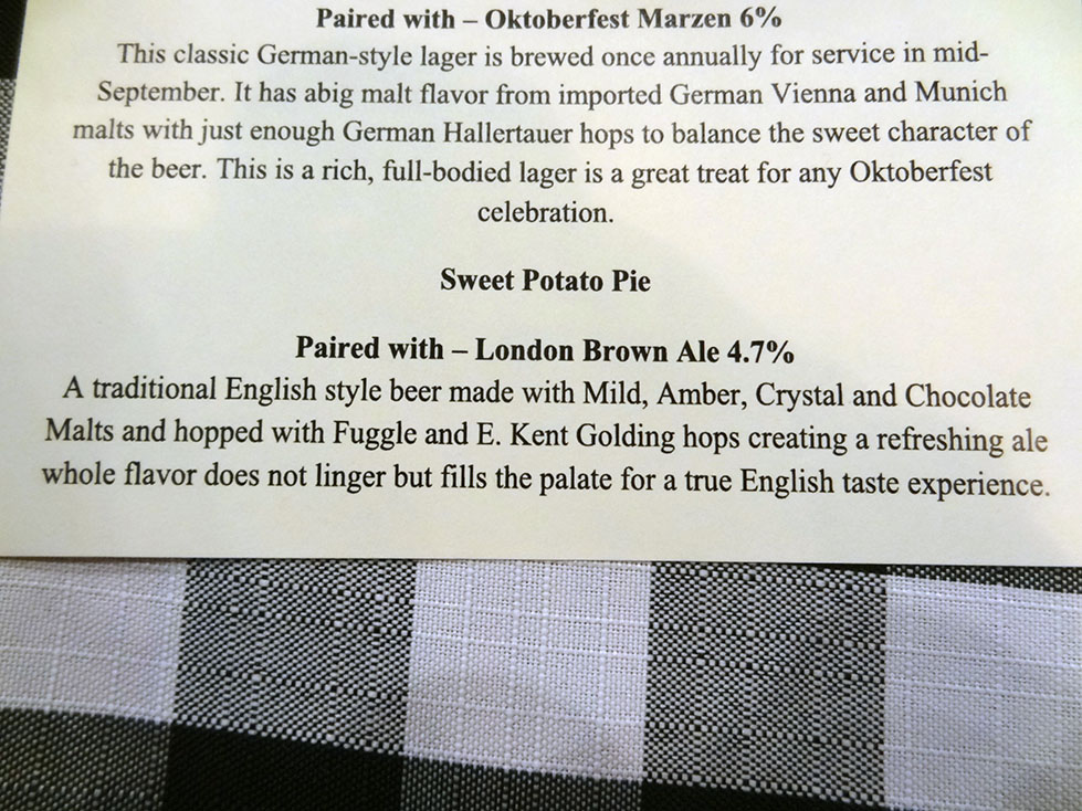 The final course was Sweet Potato Pie paired with London Brown Ale. The Ale was sweet and tasted of dark chocolate, with a caramel aftertaste. The sweet potato pie smelled like cinnamon and tasted very similar to pumpkin pie. I attributed this to the cloves that were very present throughout the dessert. It had a delectably flaky crust. Unfortunately I was super full, so I ended up taking most of the pie slice home.