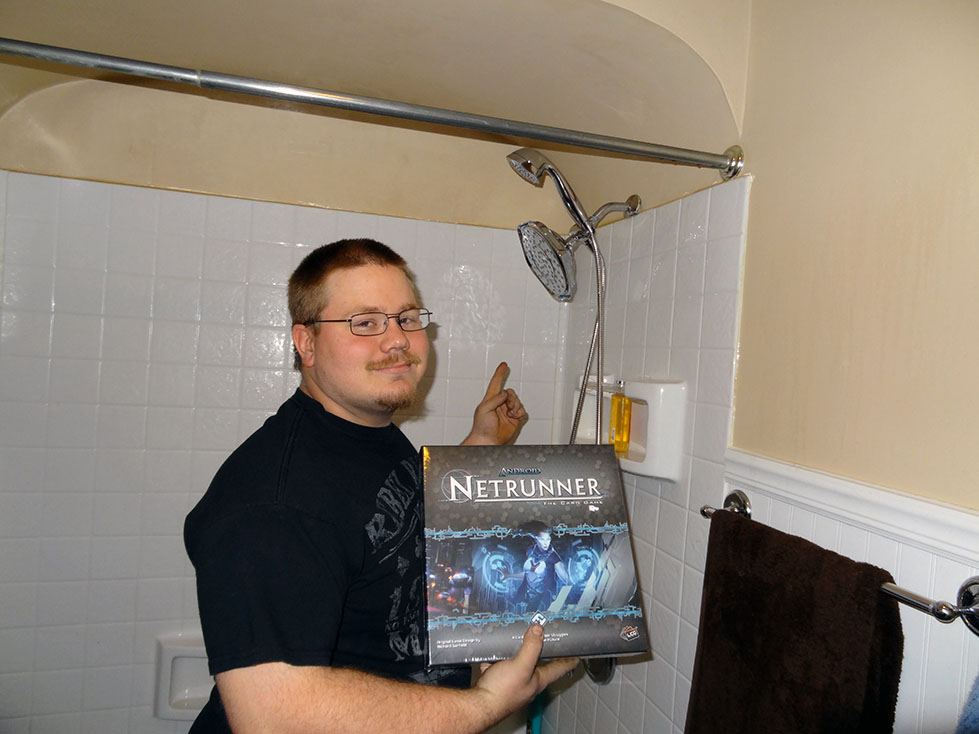 I’m now on month 10 of 12 for seeing Jimmy every month. This weekend I went up to celebrate my compadre’s 24th year on the planet. I set out with the appropriate gifts for the occasion – a new Moen showerhead and the core set for Netrunner.