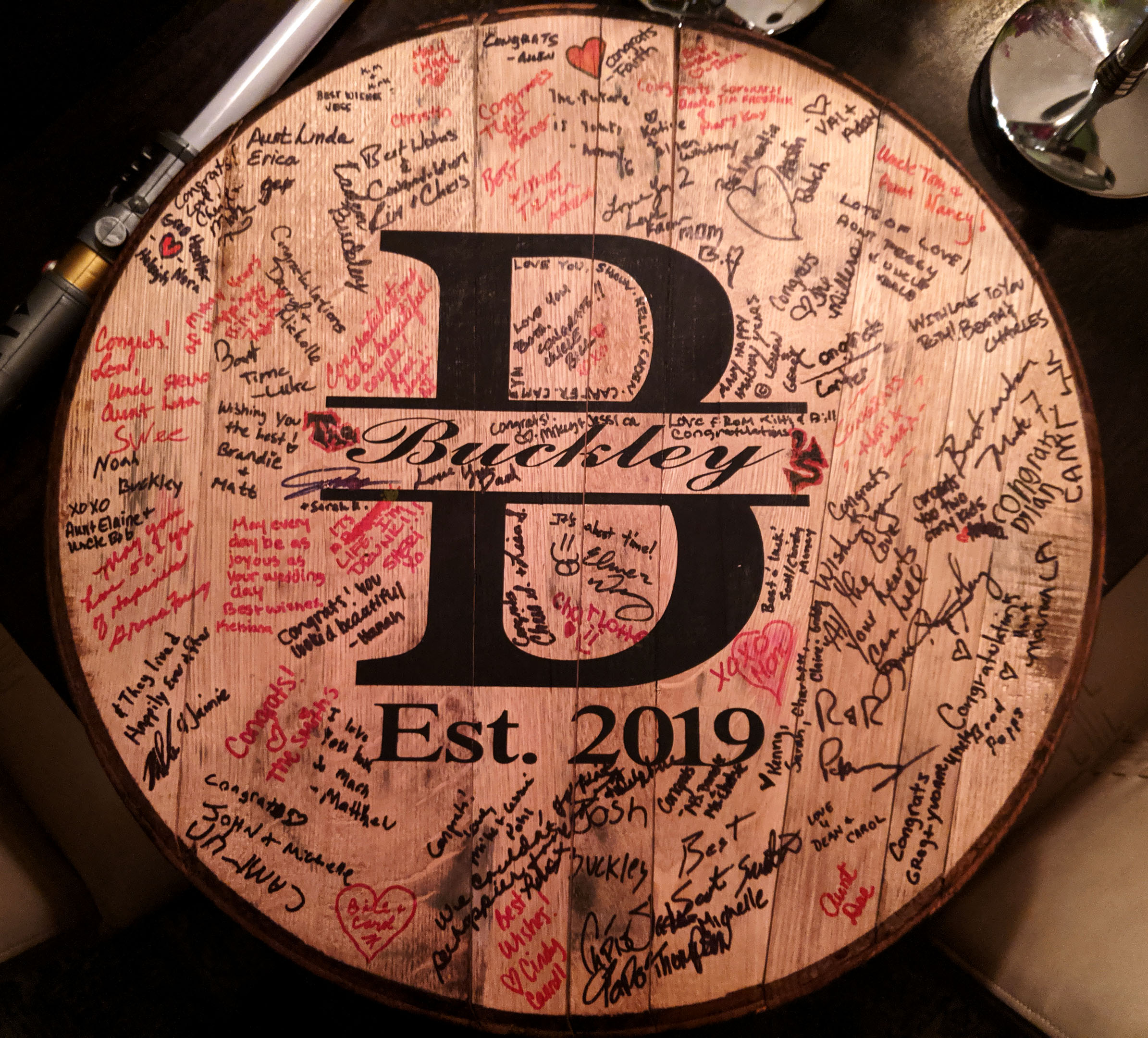 Brandi surprised Dan with a “guestbook” that was the top of a bourbon/whiskey barrel. It looked awesome and the end result really turned out great.