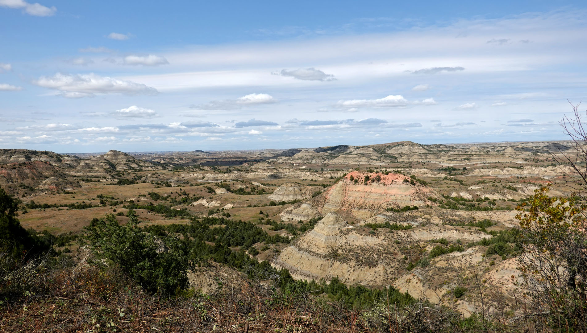 Theodore Roosevelt National Park is a huge park. It is comprised of a North Unit, Elk Ranch, and the South Unit. We only visited the South Unit. I did not know it was primarily a Badlands area. Despite having been to Badlands National Park, I was surprised by how different these two areas were. While the Badlands in South Dakota are mostly an arid landscape, the Badlands in Theodore Roosevelt National Park were teeming with flora and fauna.